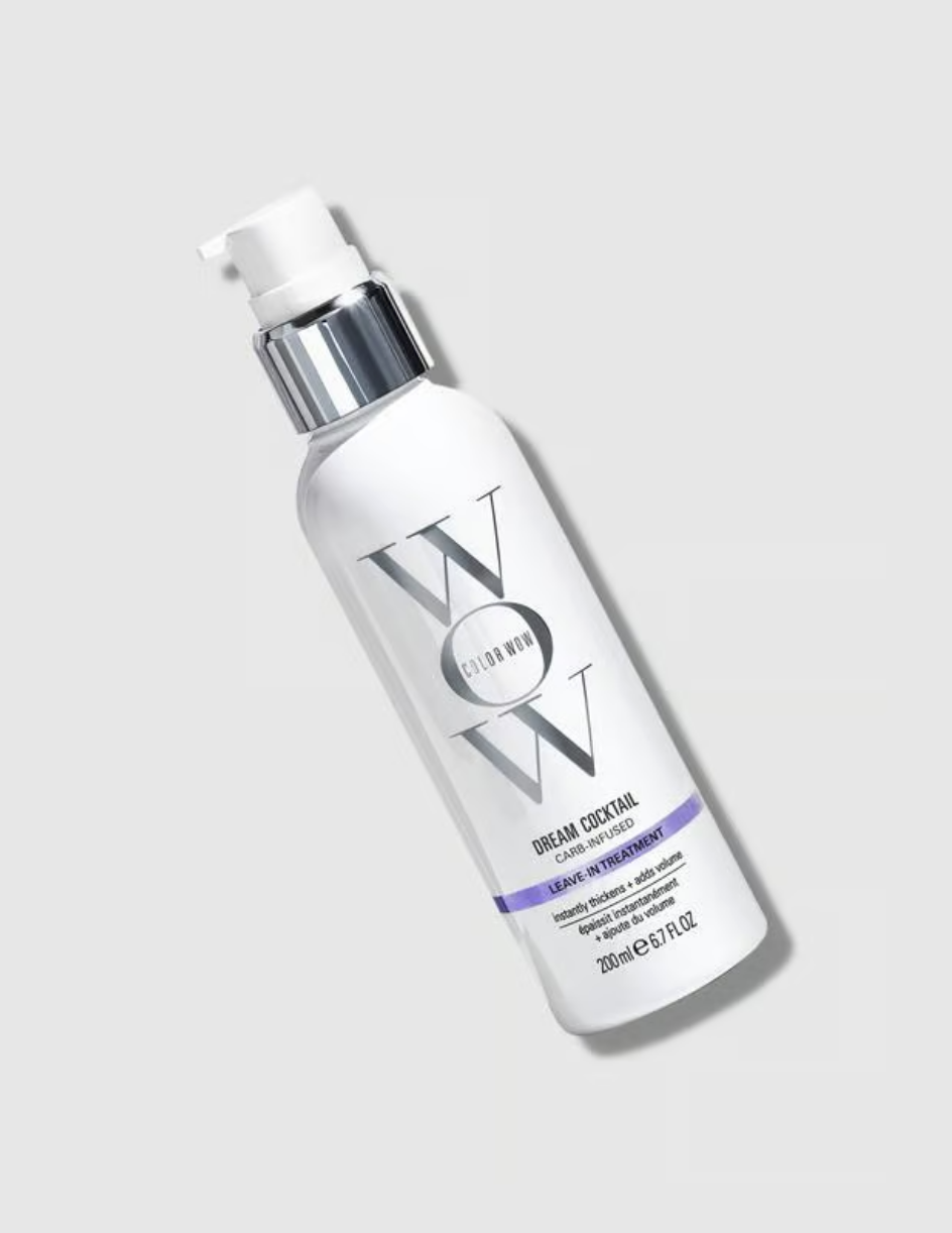 2. Shake the bottle well, then dispense two to three pumps into the palm of your hand and smooth down the hair from an inch below the split ends to the ends.